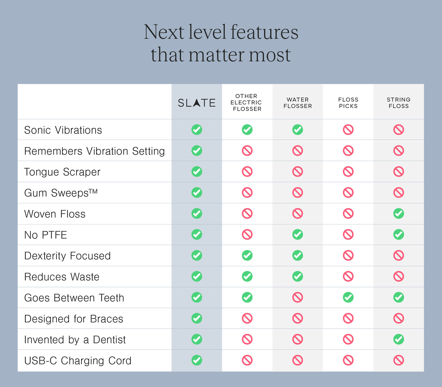 Medical studies have shown that flossing can help prevent a long list of health issues. Most notably, Alzheimers, dementia, and heart disease. Keep your mouth AND your body healthy by flossing every day with Slate.