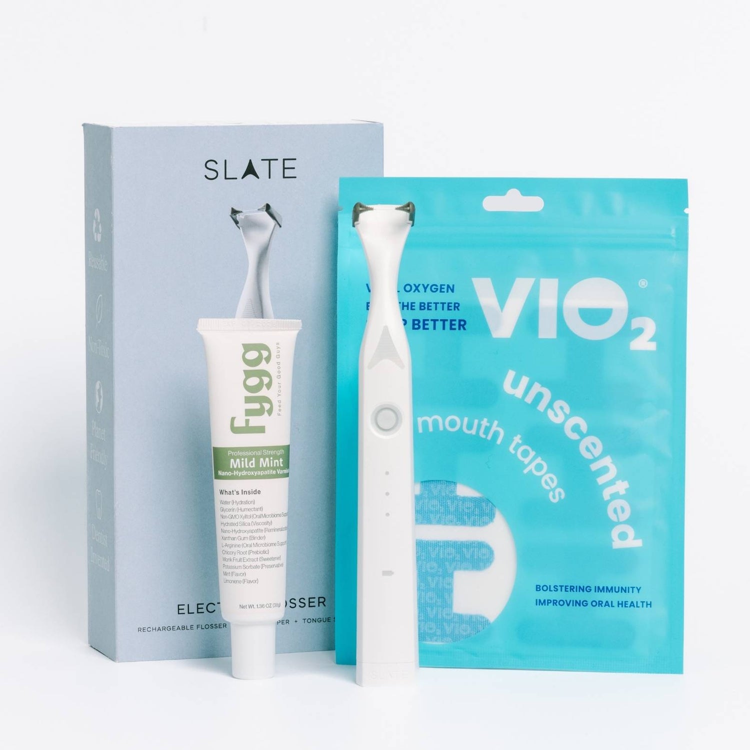 Includes: 1 Electric Flosser with 5 gray floss heads and charging cable, 1 Full Size Fygg Mint Varnish, 1 Full Size Pack VIO2 Mouth Tape