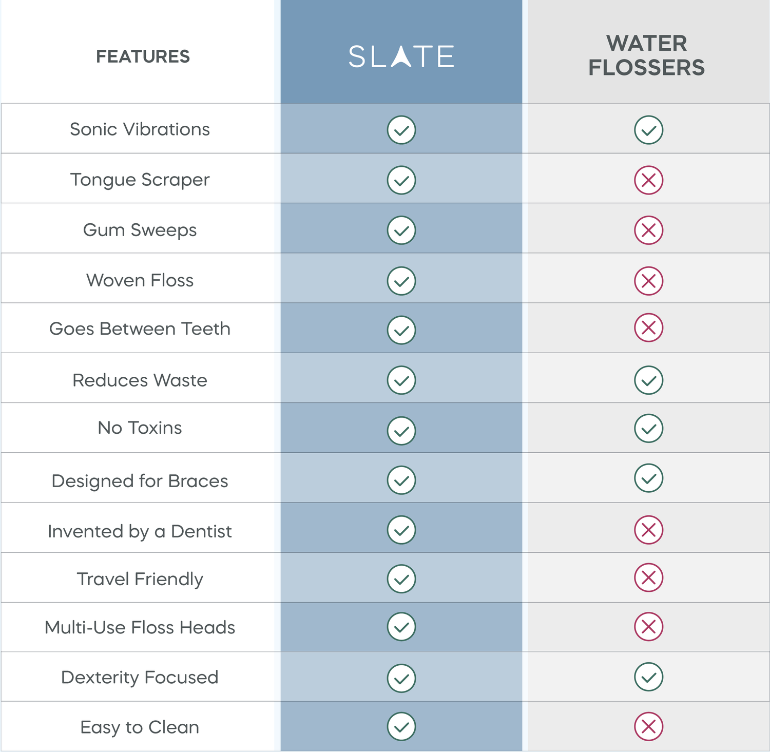 When comparing products that clean BETWEEN your teeth, the Slate Electric Flosser offers more complete oral care options than any water flosser on the market. Slate is cleaner and easier to use, too! We took the time to comprehensively compare the features of Slate. See why dentists, orthodontists, hygienists, periodontists, and customers trust and recommend the Slate Electric Flosser!