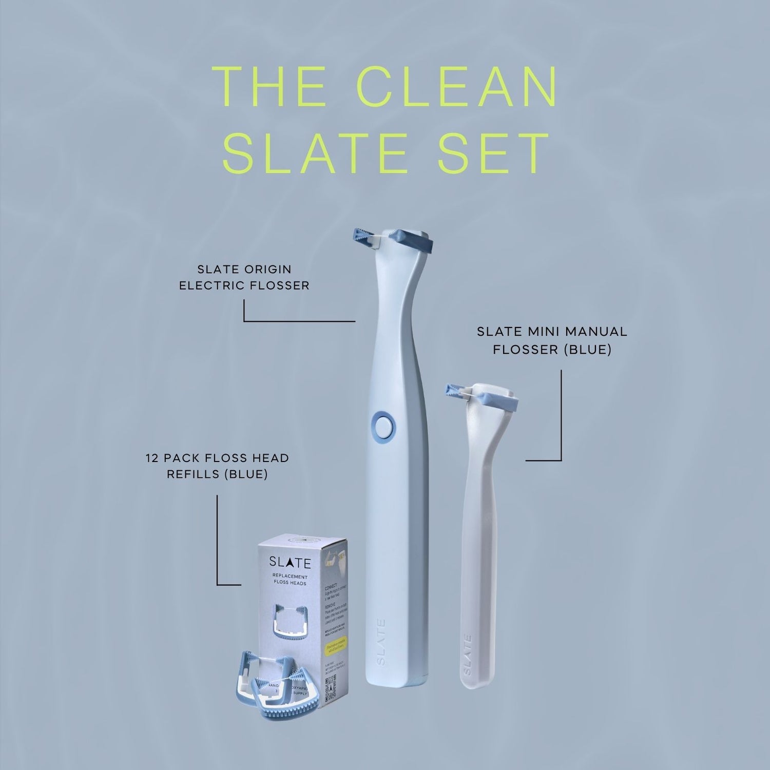 This set pairs Slate Origin, our battery-powered electric flosser, with our portable Mini Flosser and a 12-pack of refill heads, so you have the tools you need to floss more consistently wherever life happens. Each Slate flosser is designed with our signature 3-in-1 system to help clean between teeth, massage along the gumline, and clean the tongue in one simple routine