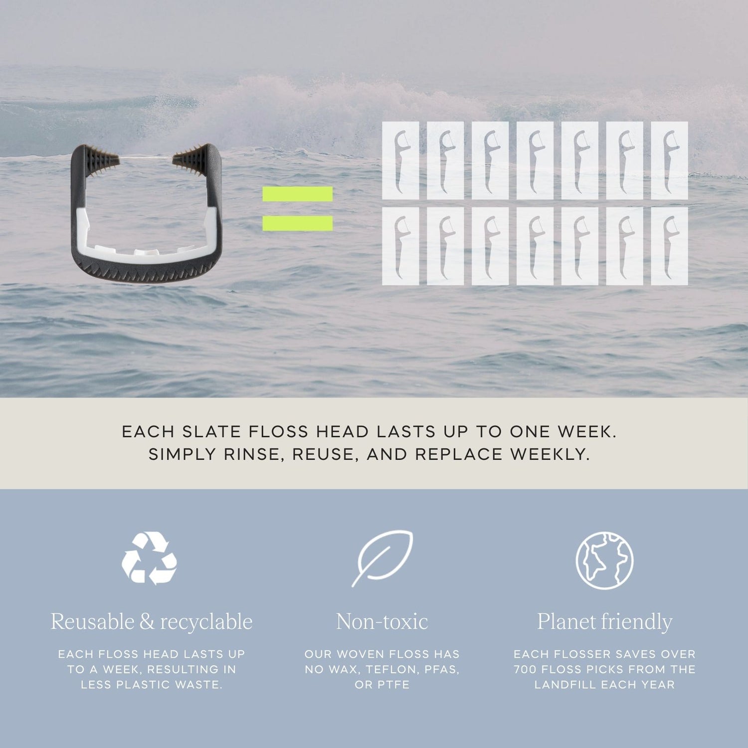 By using Slate floss heads instead of single-use floss picks, you can prevent over 700 plastic floss picks from ending up in landfills every year. Our fully-recyclable boxes further promote our mission to remain sustainable!
