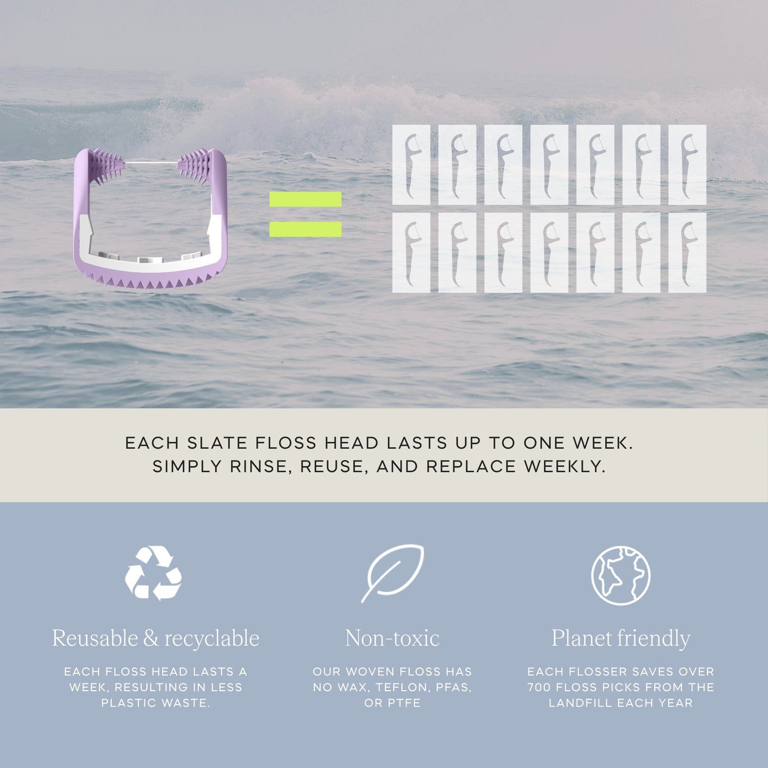 By using Slate floss heads instead of single-use floss picks, you can prevent over 700 plastic floss picks from ending up in landfills every year. Our fully-recyclable boxes further promote our mission to remain sustainable!
