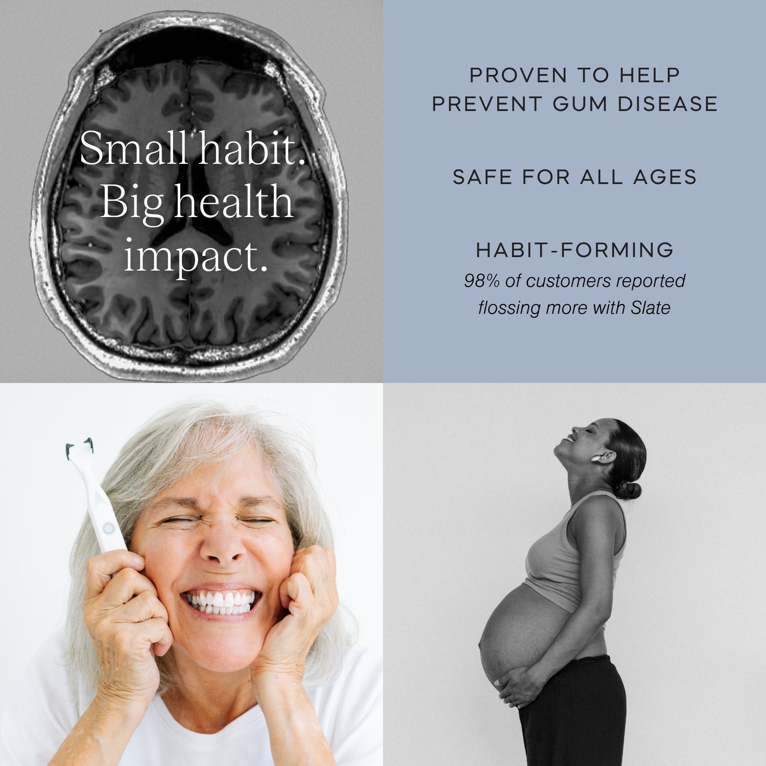 Slate’s 3-in-1 Floss Head includes woven floss, a tongue scraper, and gum brushes—our patented Gum Sweeps™—that work like a soft, flexible interdental brush to clean between teeth and along the gumline.