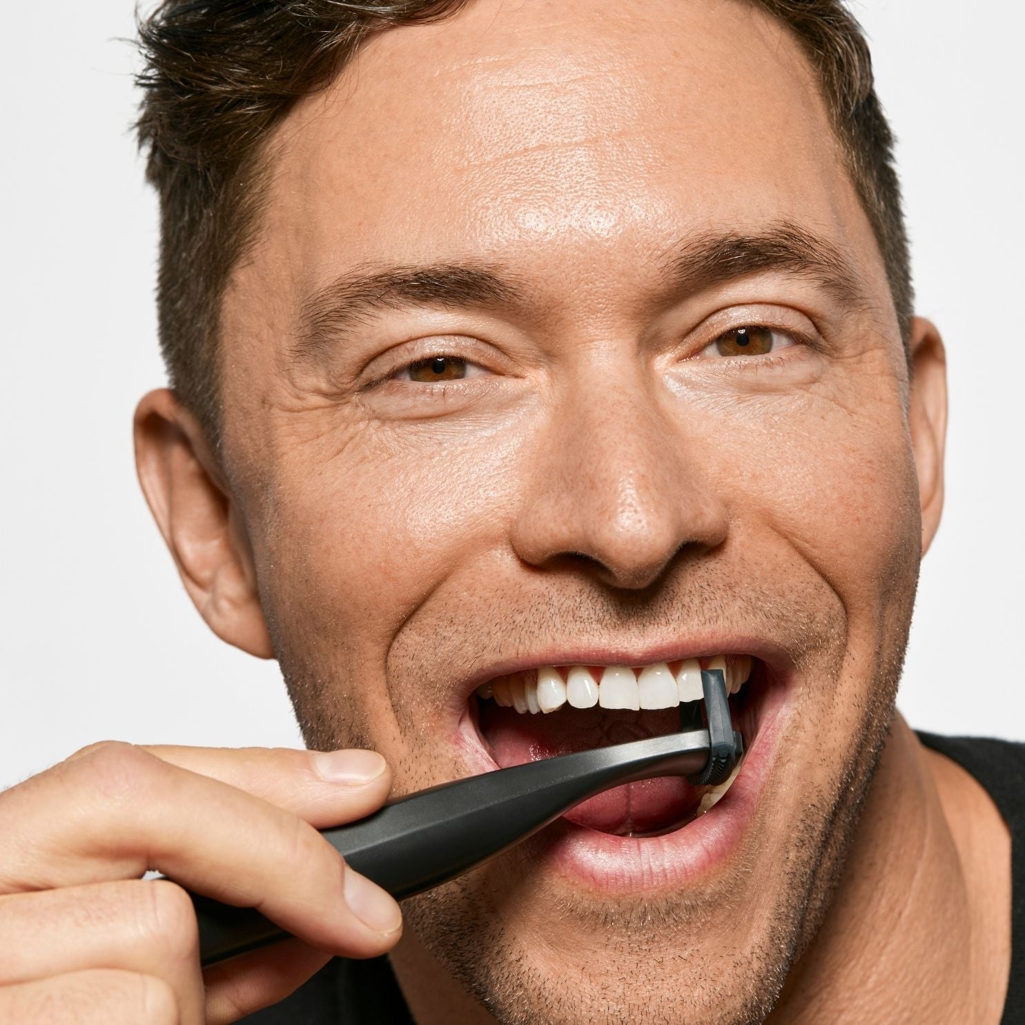 Brushing only cleans about 60% of your mouth. Slate Origin is designed to help clean the rest. This battery-powered electric flosser uses 12,000 sonic vibrations and Slate’s signature 3-in-1 floss head to floss between teeth, massage along the gumline, and clean the tongue in one simple routine.