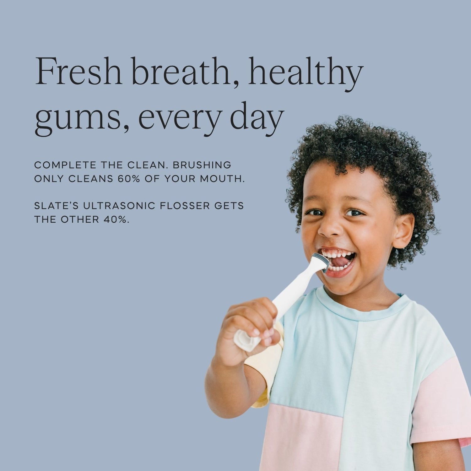 Brushing only cleans about 60% of your mouth. Slate finishes the job with non-toxic woven floss, silicone gum brushes, and a triple-row tongue scraper for a 100% clean.