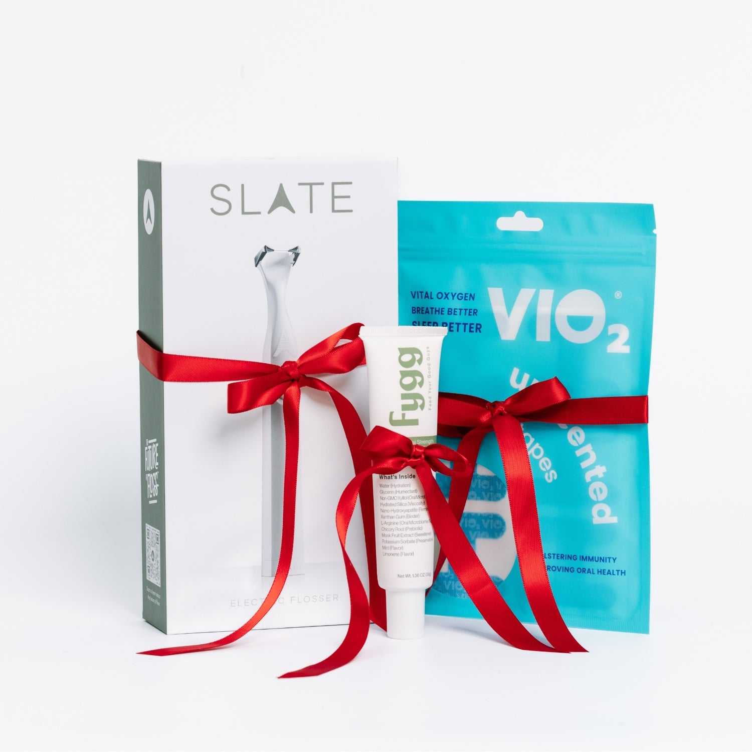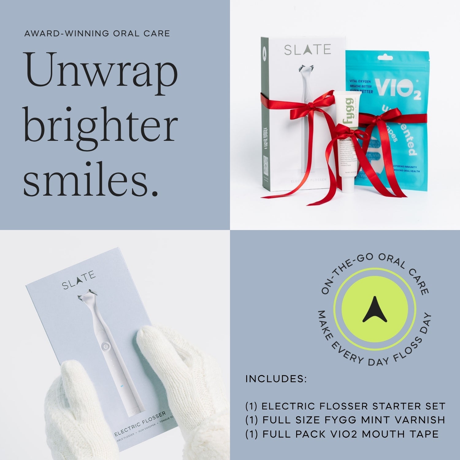 Includes: 1 Electric Flosser with 5 gray floss heads and charging cable, 1 Full Size Fygg Mint Varnish, 1 Full Size Pack VIO2 Mouth Tape