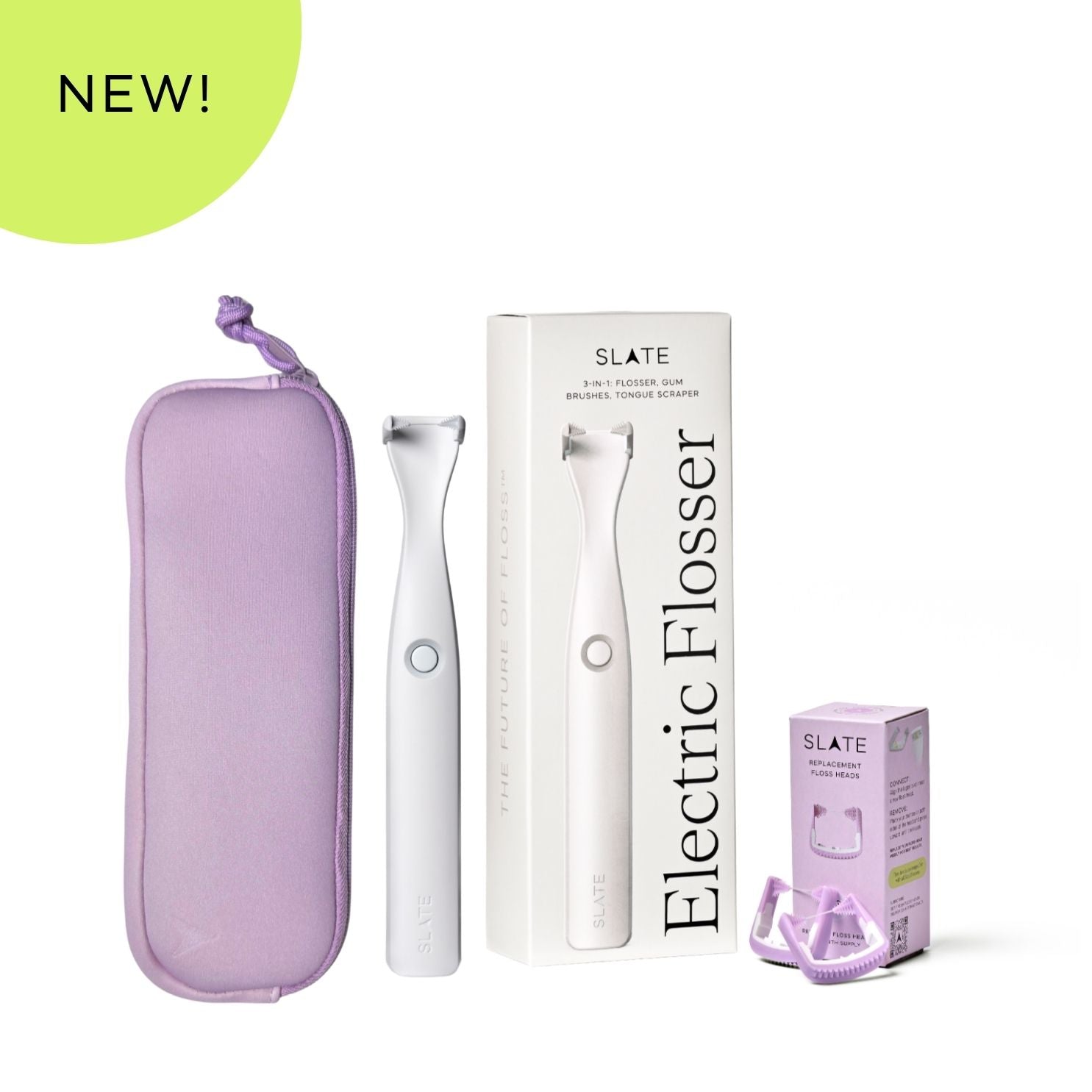 This set includes Slate Origin, our battery-powered electric flosser, paired with a protective zip travel case and a 12-pack of refill heads so you can pack your routine in one place and keep it going longer. With 12,000 sonic vibrations and Slate’s signature 3-in-1 floss head design, Origin helps clean between teeth, massage along the gumline, and clean the tongue in one simple routine.